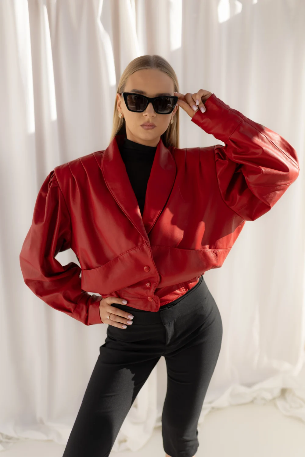Scarlett to wyrazista kurtka o charakterystycznej rzeźbiarskiej formie i szeroko zarysowanych ramionach, które nadają sylwetce modowego charakteru i wyrazistości. Wykonana z bardzo lekkiej, naturalnej skóry jagnięcej, dzięki czemu jest niezwykle komfortowa i pięknie układa się na sylwetce. Model posiada rozmiar uniwersalny, a dzięki regulacji w talii można dopasować kurtkę do różnych typów sylwetki, podkreślając jej proporcje. To nowoczesna skórzana kurtka, która łączy ponadczasową elegancję z odważną, rzeźbiarską formą.
